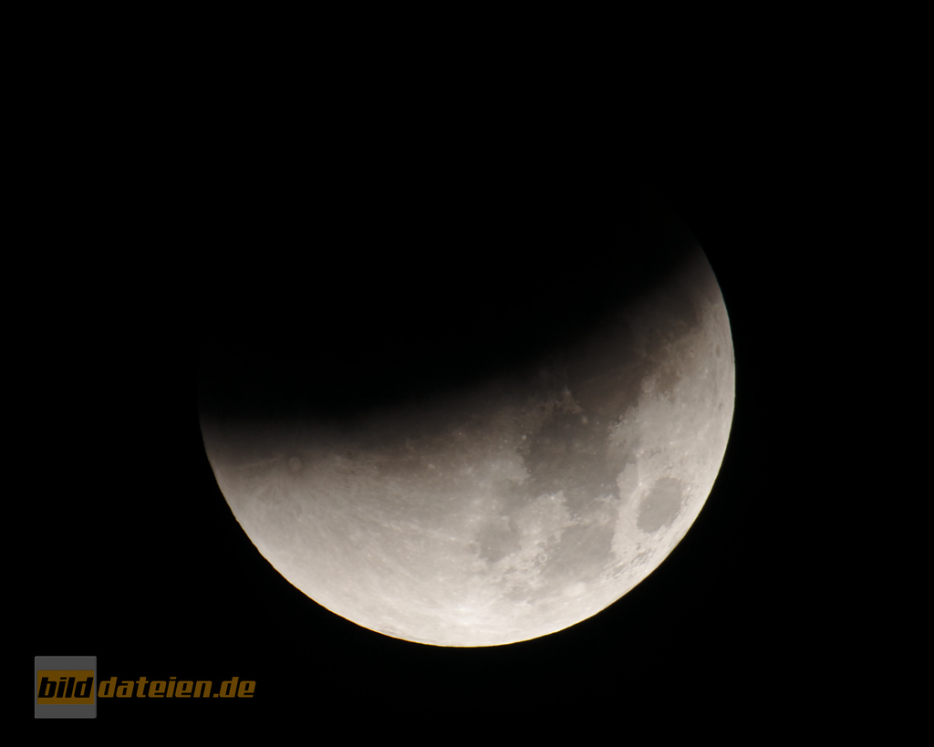 Ab 3:07 bewegte sich der Mond zunehmend in den Kernschatten der Erde hinein, zu sehen war eine zunehmende deutliche Verdunkelung von links oben her: